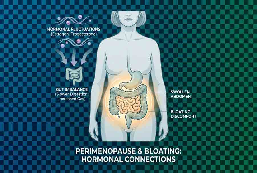 "The gut has receptors for estrogen and progesterone. When these hormones fluctuate during perimenopause, digestion slows. Food sits longer. Gas builds. The belly distends. This is biochemistry — not a character flaw."